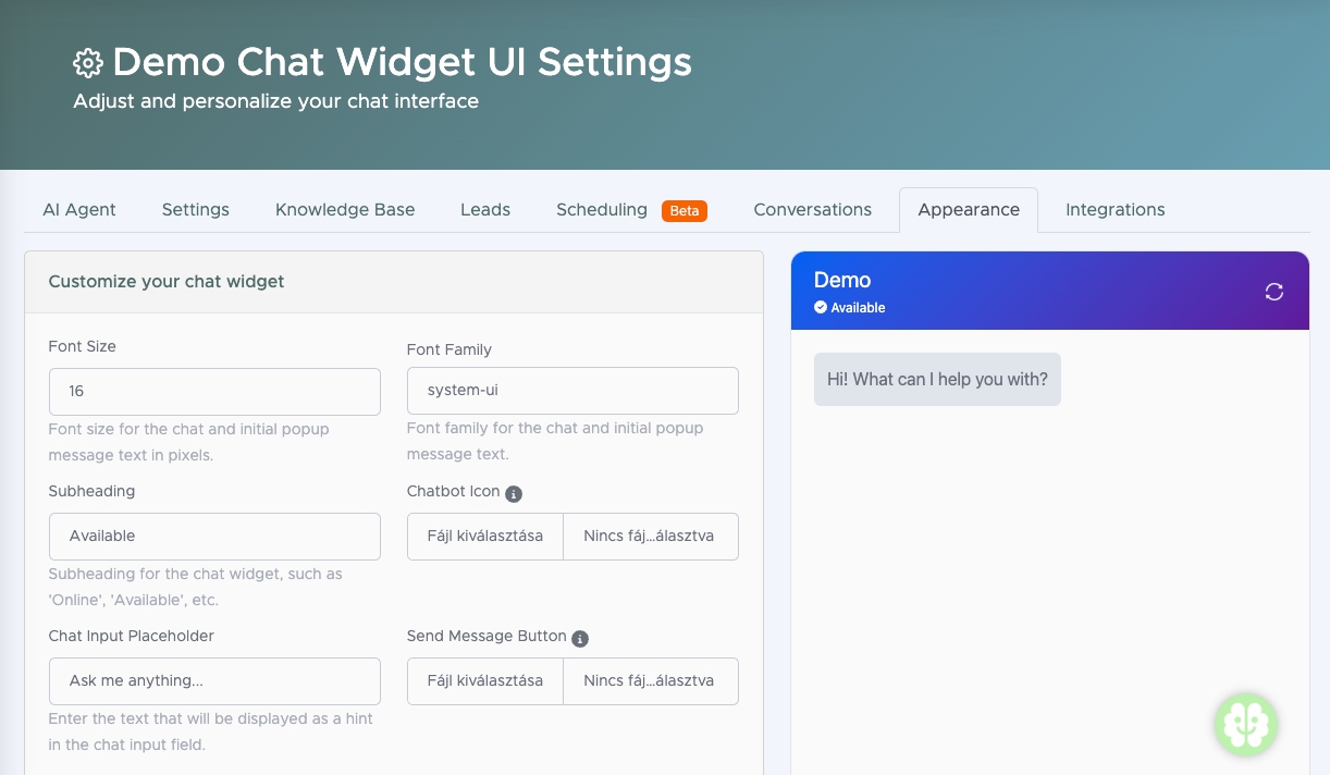 A chat widget megjelenésének testreszabásához válassz ki egy AI ügynököt, majd navigálj a Megjelenés fülre. Itt számos opció áll rendelkezésre, amelyek segítségével szinte minden aspektusát személyre szabhatod.