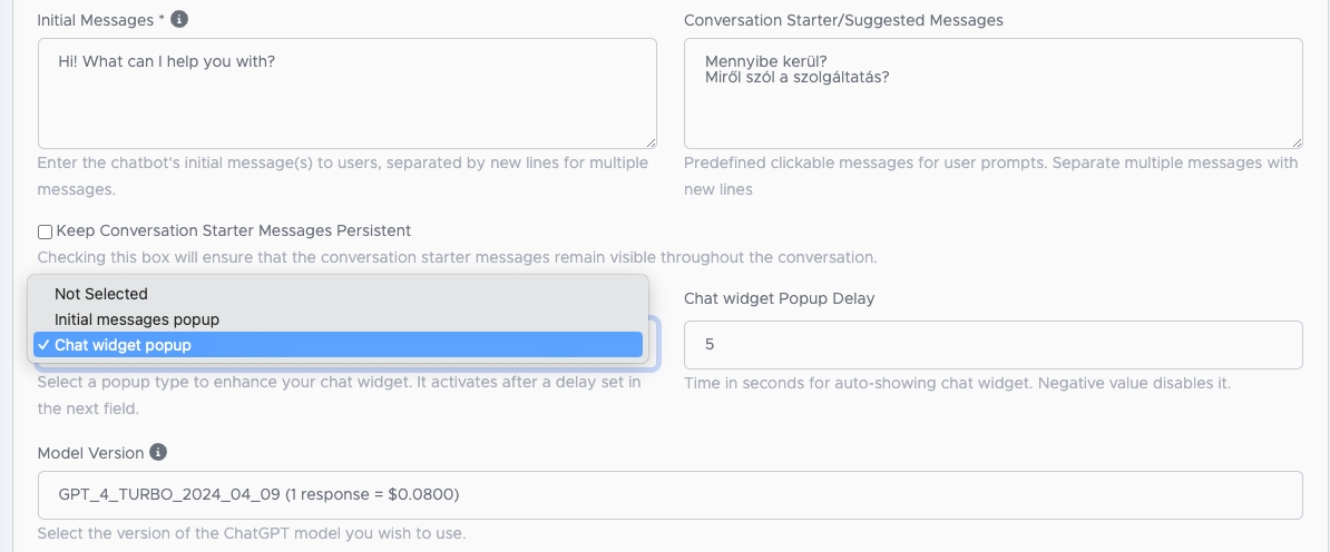 A kezdő üzenetek úgy jelennek meg a felhasználóknak, mintha az AI ügynöktől érkeztek volna a chat widget felületén. Ez hatékony módszer lehet a felhasználók figyelmének felkeltésére és a chatbot interakcióra ösztönzésére.