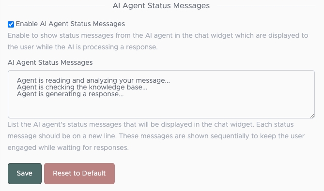 Engedélyezd ezt a funkciót, ha azt szeretnéd, hogy a chat widgetben az AI ügynök állapotüzenetei is megjelenjenek a felhasználó számára, miközben a válaszokat feldolgozza.