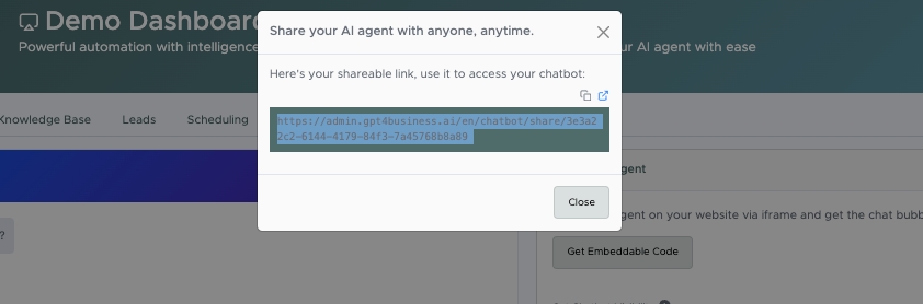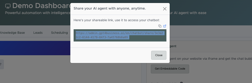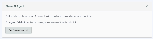 Szerezz egy linket, amellyel bárkivel, bárhol és bármikor megoszthatod a chatbotodat. Ezzel a funkcióval az AI ügynök linkjét bárkivel megoszthatod, így az mindenki számára elérhető, aki rendelkezik a linkkel.