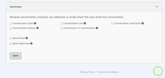 Amikor egy beszélgetés véget ér, az AI ügynöktől származó összes információt elküldheted e-mailben és/vagy webhookon keresztül.
