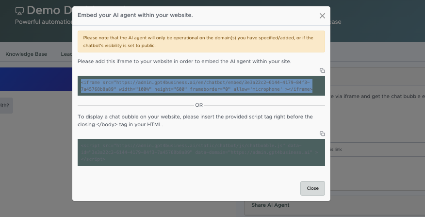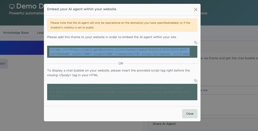 Weboldalba Illesztés: Használd a megadott kódot az AI ügynök beágyazásához a weboldaladba.