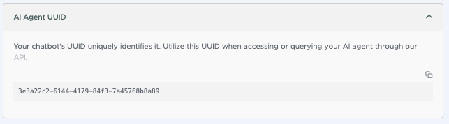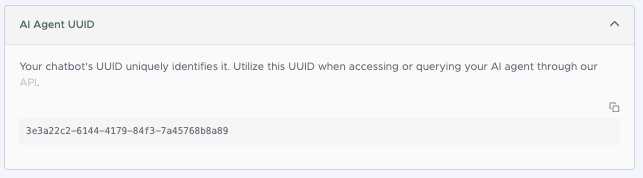 A chatbot UUID az azonosító, amelyet API-használatkor a chatbot üzenetek küldésére és fogadására használsz.