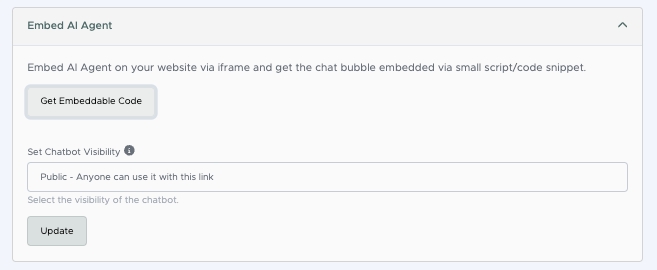 Az EmbedAI ügynök funkció lehetővé teszi, hogy AI ügynöködet zökkenőmentesen integráld bármely weboldalba. A "Beágyazható Kód Lekérése" gomb megnyomásával megkapod a szükséges HTML vagy iFrame kódot a beágyazáshoz.