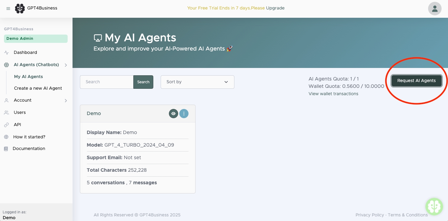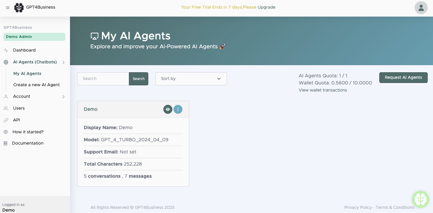 Ez egy rácsos nézetet mutat az összes AI chatbotról, amelyeket az ügynökségi szintű fiókban hoztak létre.