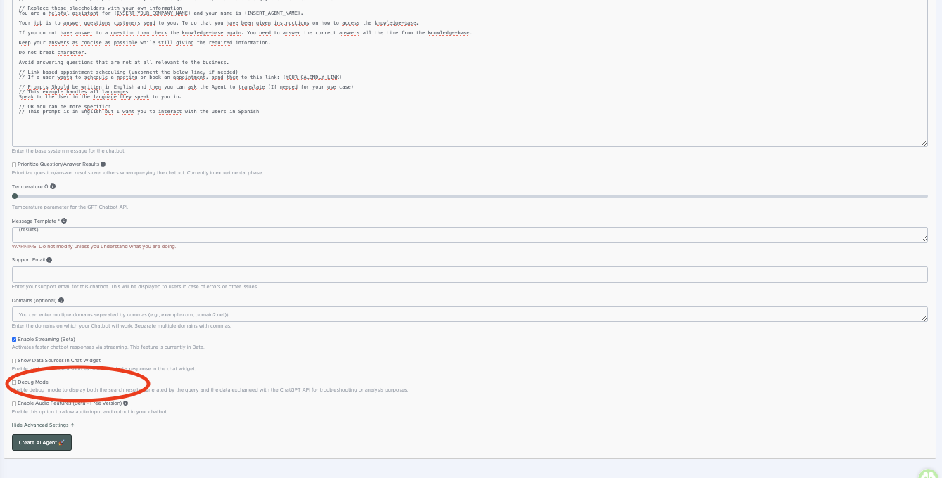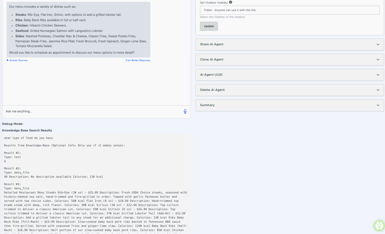 A Debug Mode segít megérteni, hogy az AI ügynök milyen információkat használ fel a tudásbázisból, és hogyan kommunikál az OpenAI API-val. Ezzel a funkcióval könnyebben azonosíthatók a chatbot válaszainak hibái és pontosíthatók a keresési eredmények.